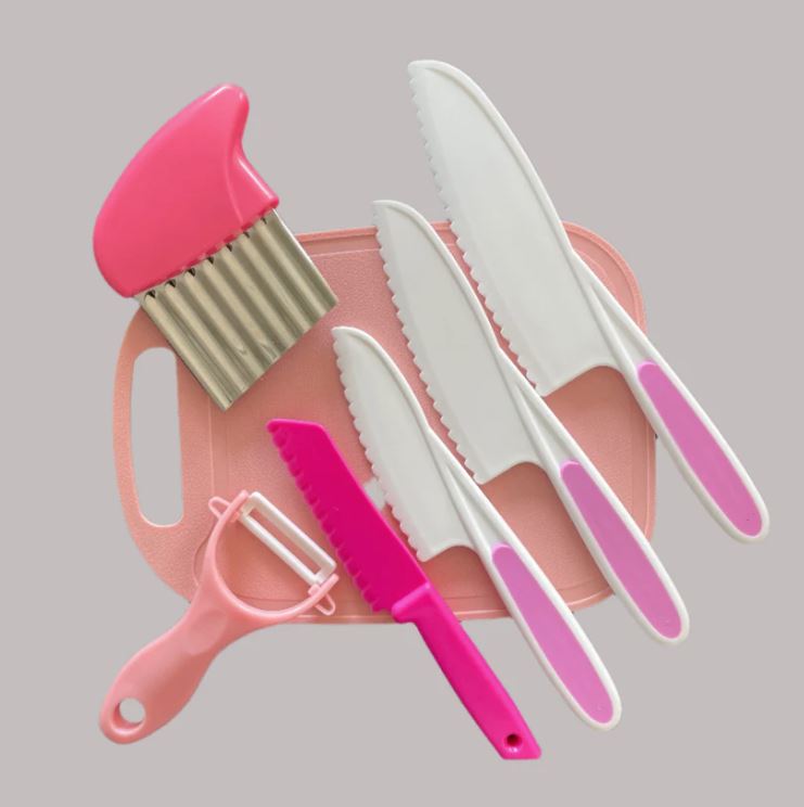 Sættet indeholder alt, hvad en lille kok har brug for: 4 børnevenlige knive i forskellige størrelser, et skærebræt, en grøntsagsskræller og en sjov bølgeskærer.